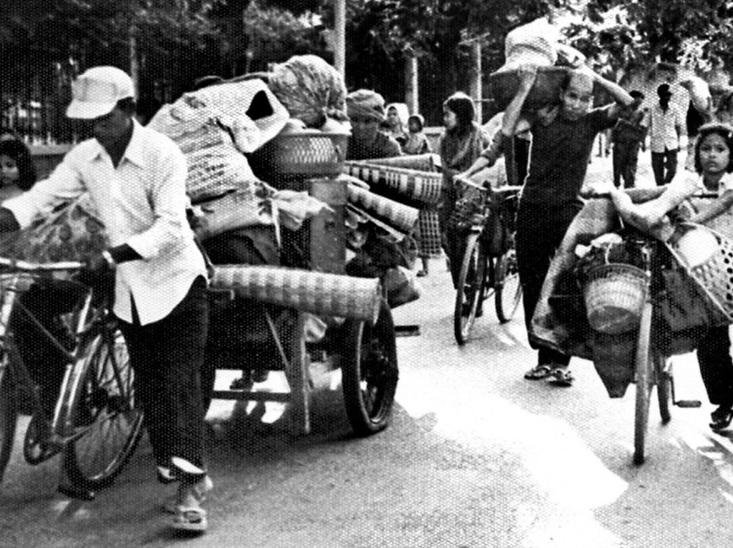 Le lendemain, l’Angkar, Parti communiste du nouveau Kampuchéa démocratique, annoncent dans les haut-parleurs de toute la ville : « Mes chers citoyens, à partir de demain, vous devez sortir de vos maisons et quitter la ville de Phnom Penh pendant trois jours, car les Américains vont bombarder la ville. Vous devez quitter la ville par les routes extérieures les plus proches sans passer par le centre-ville. »
