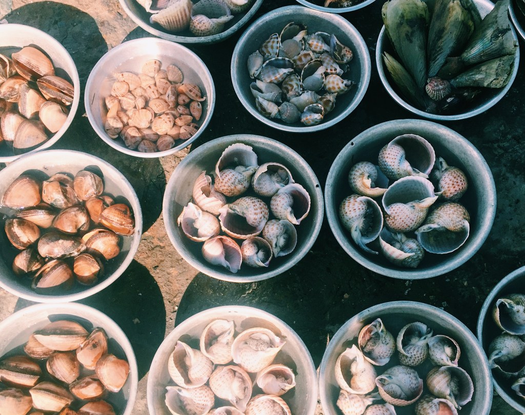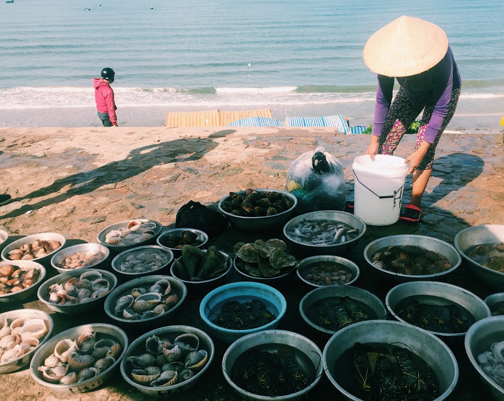 C’est au petit matin que cet authentique village de pêcheurs est le plus actif, alors que les bateaux rentrent de leur pêche nocturne et débarquent leurs prises fraîches. Vous pouvez y voir tout un tas de poissons différents, des raies, des crabes, des homards… Nous sommes arrivés vers 8h, après le retour des bateaux (pas pu se lever aux aurores !), mais l’activité était encore présente. De jolies scènes de vie locale comme je les aime en Asie, au milieu des iconiques bateaux-paniers vietnamiens.