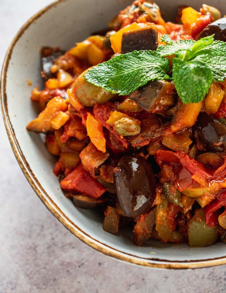 - Kapunata : c’est une ratatouille à base d’aubergines, d’oignons, de tomates, de céleri, d’olives vertes et de câpres. Servie chaude ou froide, elle accompagne d’autres plats.