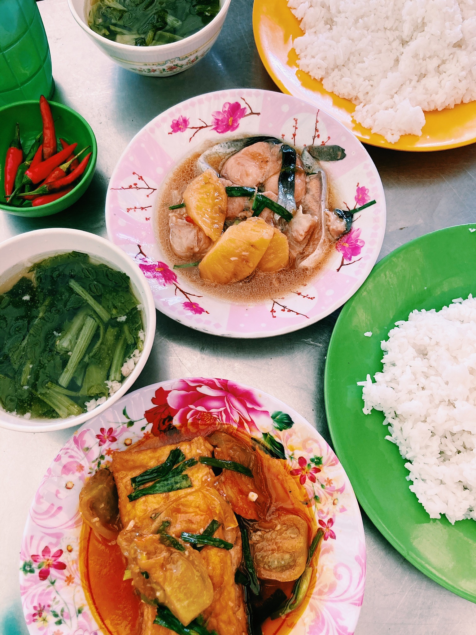 Note : Nous avons été légèrement déçus de ne pas trouver de restaurant ouvert et prêt à servir des fruits de mer… peut-être la rue est-elle plus animée le soir ? Nous y étions un samedi midi et nous nous attendions à avoir le choix, mais la rue était très calme et la plupart des restaurants étaient fermés. Nous nous sommes arrêtés au restaurant Ốc Loan et nous sommes régalés avec du saumon à l’ananas et un gâteau de poisson relevé à la sauce tomate. Les deux plats étaient accompagnés d’une copieuse assiette de riz, d’une soupe, de thé glacé et de bananes pour le dessert.