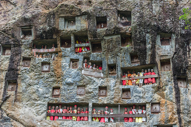 La tribu Toraja est l’un des quatre groupes ethniques du sud Sulawesi, dont le nom signifie « peuple des hautes terres ». Véritable cœur culturel de l’île, les villages y pratiquent encore des traditions profondément ancrées, empreintes de croyances et de rituels. L’une des plus singulières est la cérémonie des funérailles, qui peuvent durer entre 1 à 7 jours. Des buffles sont sacrifiés tous les jours durant les funérailles. Le dernier jour, le corps est placé dans la roche et sera orné de sculptures et reliques qui représentent la personne défunte. Pas des plus faciles à voir j’imagine, mais ça m’intrigue !