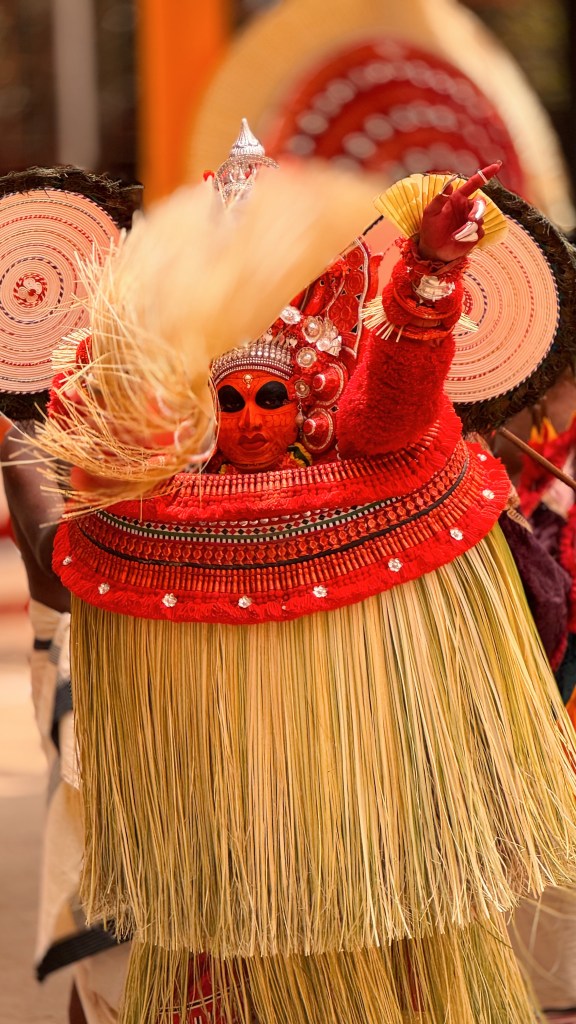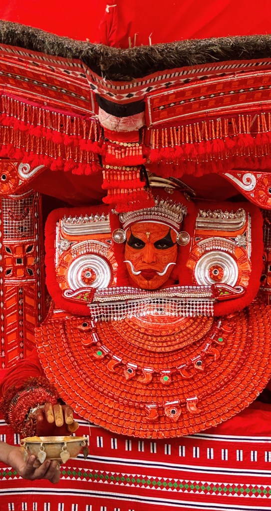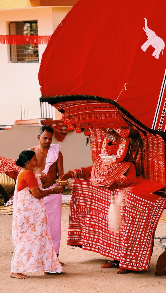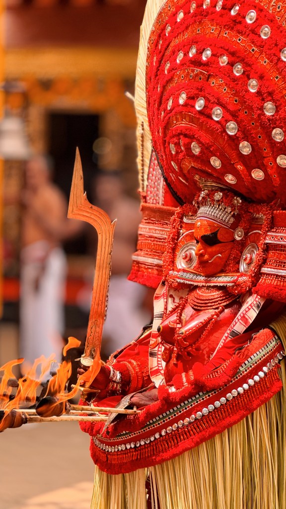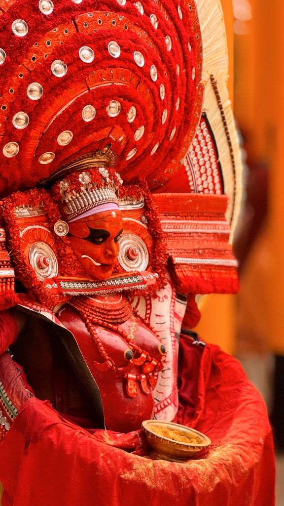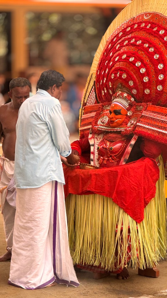 Bien plus qu’un simple spectacle, c’est l’incarnation vivante d’une divinité. Le mot Theyyam vient de Daivam, qui signifie « dieu ». Pendant la cérémonie, un homme (souvent issu d’une caste inférieure) devient littéralement le dieu ou l’esprit qu’il représente. Les fidèles viennent alors lui parler, lui demander des bénédictions, des conseils, parfois même des guérisons.