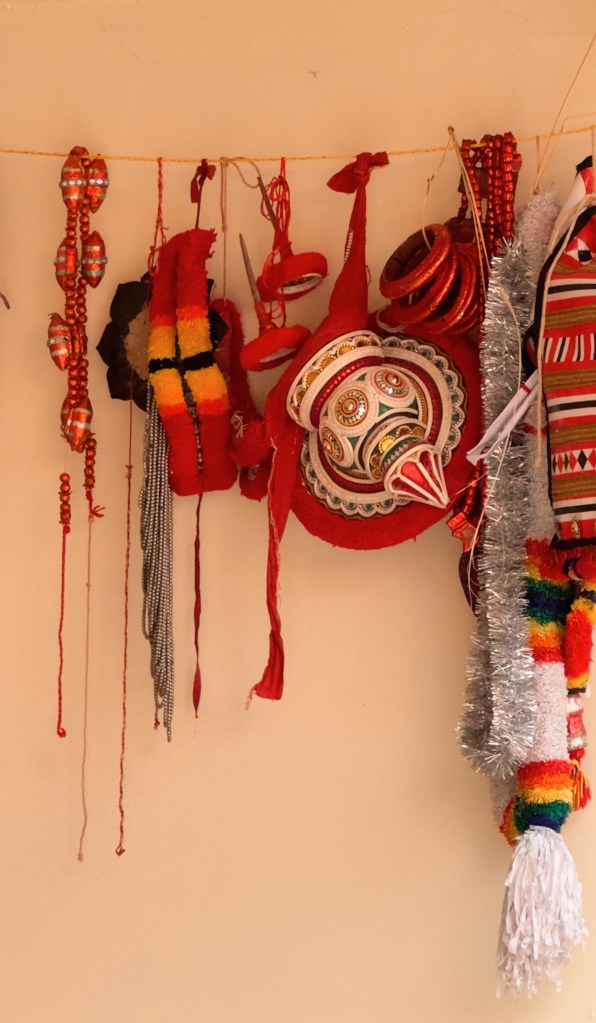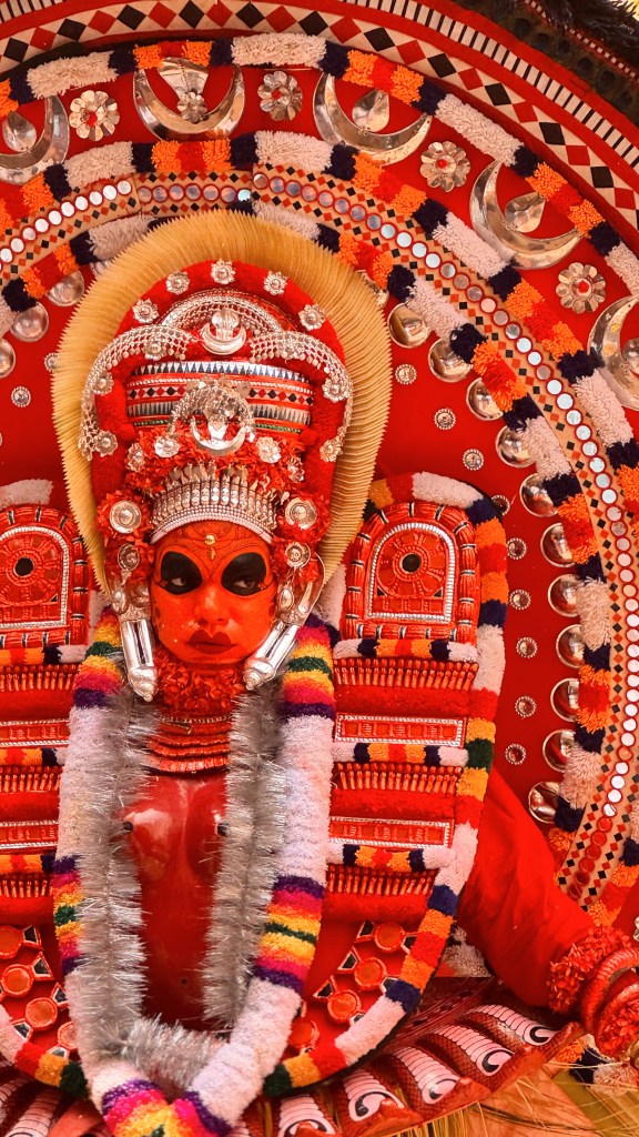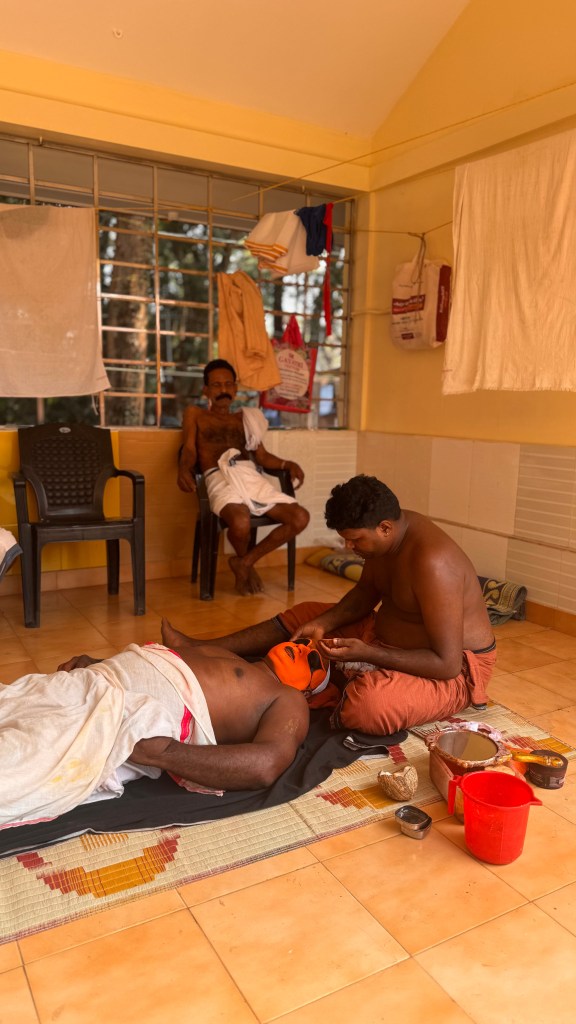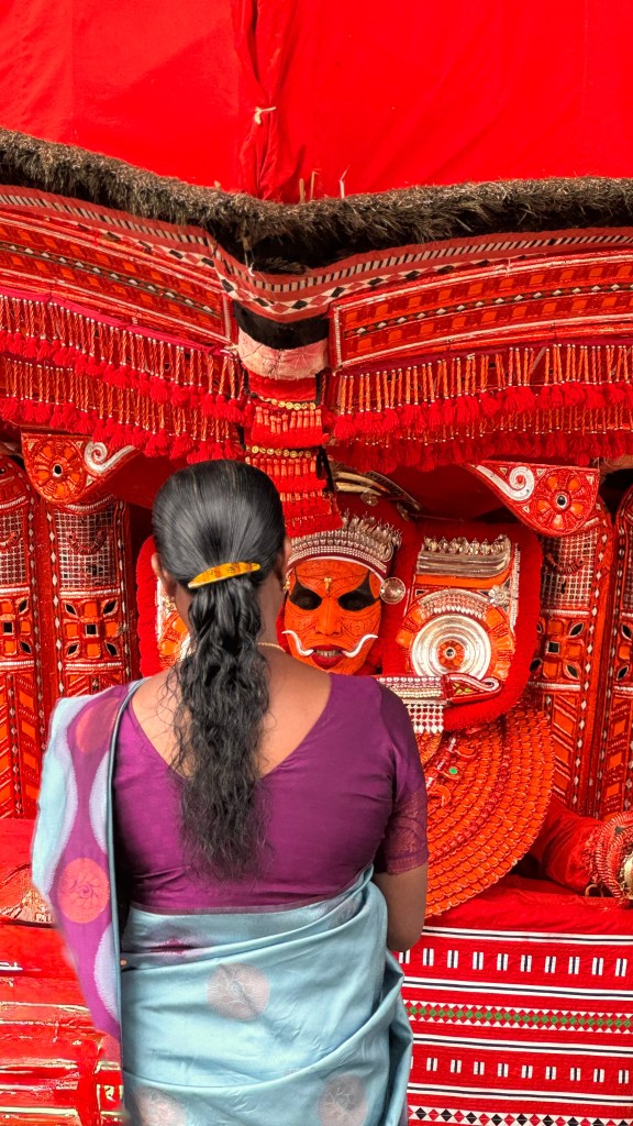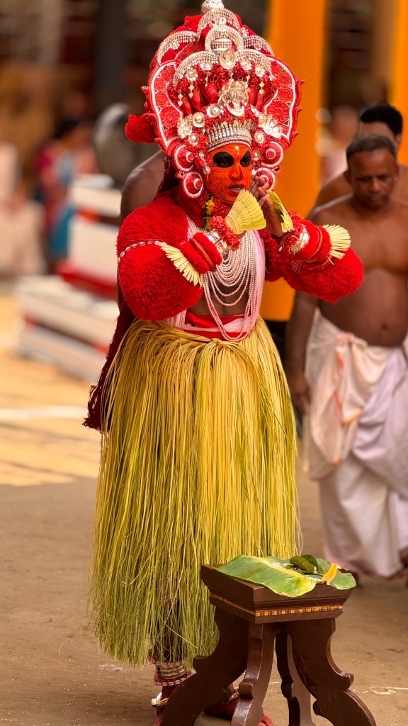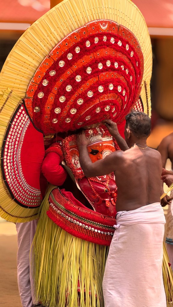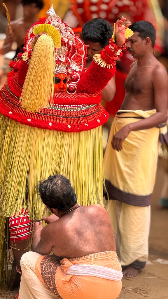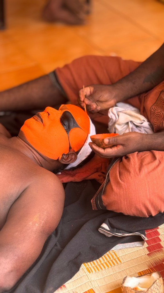 La préparation peut durer plusieurs heures et la transformation des hommes en dieux est fascinante ! Nous sommes arrivés tôt sur place pour voir l’étape du maquillage, qui est une réelle expérience en soi : maquillage ultra-détaillé à la main aux pigments naturels, costumes rouges flamboyants, clochettes et armes symboliques. On recense plus de 400 formes différentes de Theyyam, chacune avec son costume, son maquillage, son mythe.