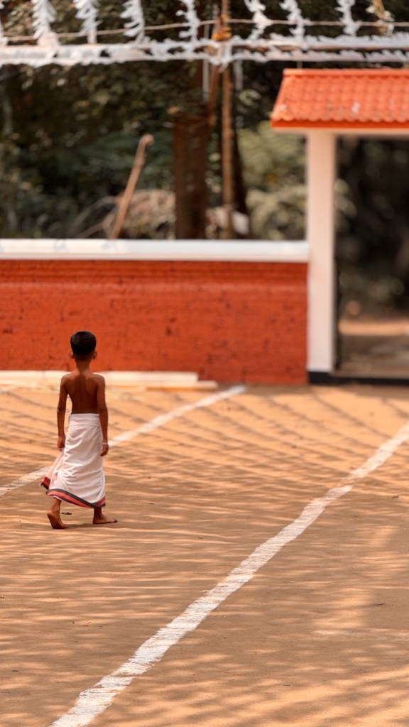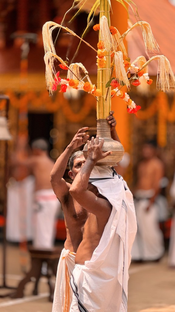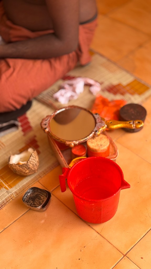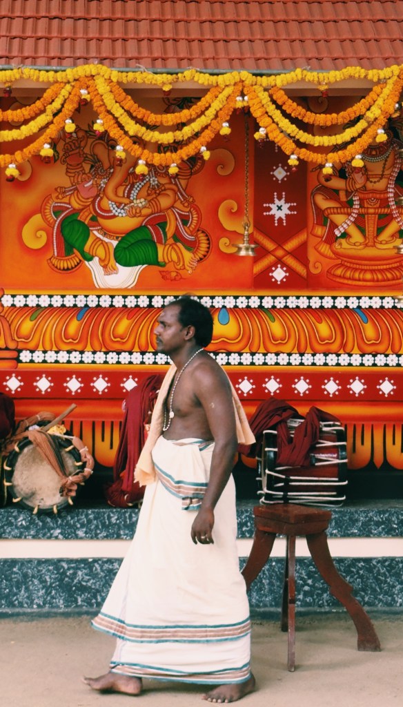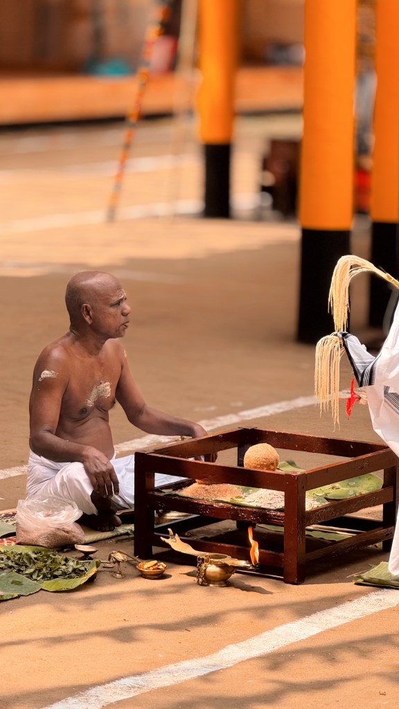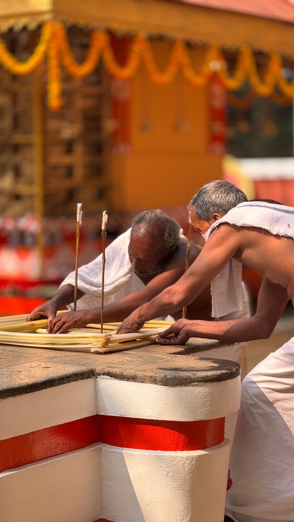 En parallèle de la préparation des Theyyam, ce sont les prêtres hindous qui s’affairent aux préparatifs : tout doit suivre un rituel bien établi, avec de nombreuses étapes. Le temple est une dernière fois purifié.