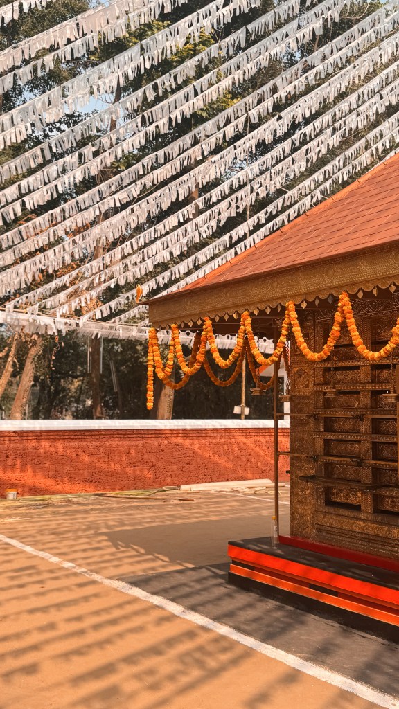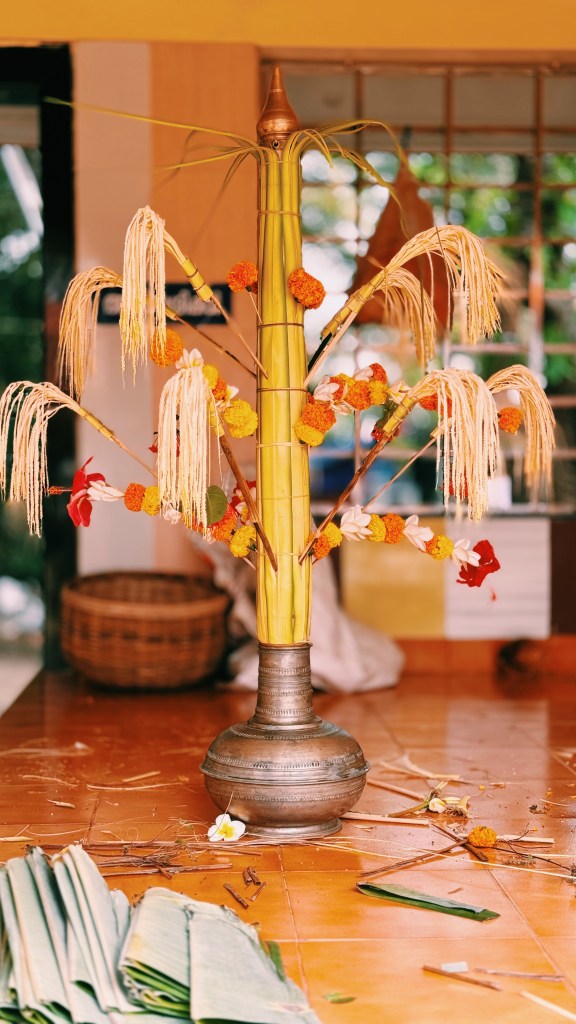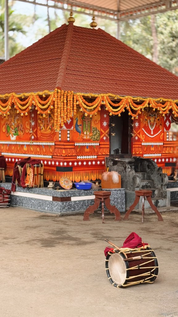 Le Theyyam se déroule principalement dans de petits sanctuaires appelés kavu (temples sacrés, souvent en pleine nature). Quelques jours avant la cérémonie, le kavu est d’abord purifié physiquement et spirituellement, puis entièrement décoré : feuilles de palmier tressées, guirlandes de soucis et de jasmin, lampes à huile en bronze, installation de l’autel, offrandes disposées çà et là (fleurs, bananes, noix de coco, riz…).