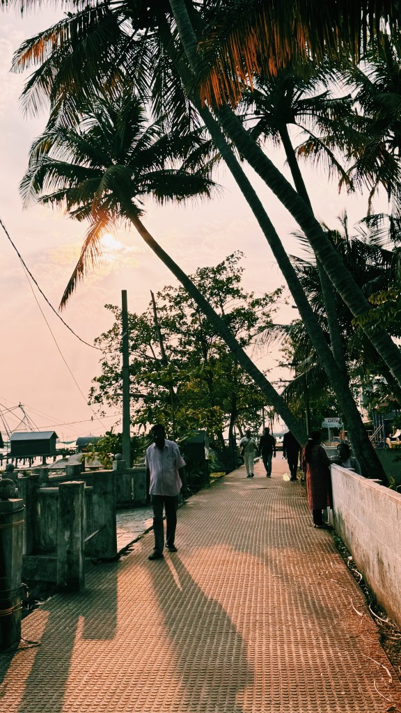 Une excellente alternative pour voir les filets de pêche chinois au coucher du soleil, sans aucun touriste, est de traverser en ferry pour rejoindre la péninsule de Vypin, beaucoup plus locale et bien plus scénique que Fort Kochi. Il vous suffit de prendre le ferry local depuis la jetée de Fort Kochi pour quelques roupies, puis de longer la Vypin Walk Way. J’ai largement préféré ce côté de la ville en fin de journée !